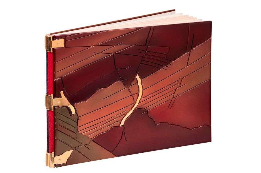 In-8 oblong, plats en polycarbonate, mosaïqué de pièces en polycarbonates en relief, le tout peint à l'aérographe dans les tons brun et vert, avec des incrustations de pièces de cuivre jaune, dorées, montées sur charnière, dos de maroquin bordeaux et noir, couverture, chemise et étui de même matière (Reliure Edgard Claes).