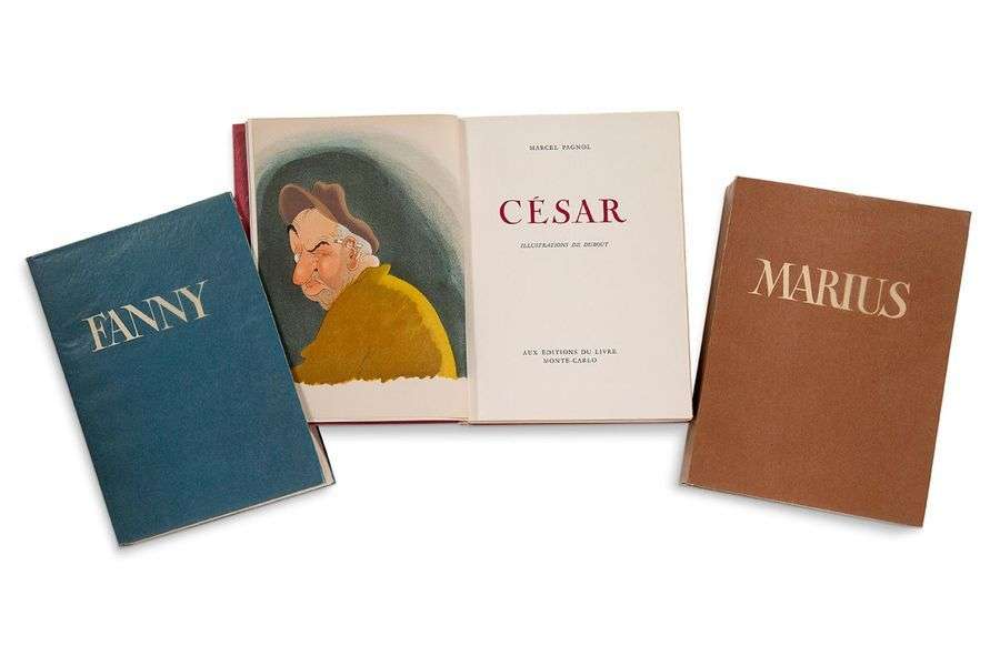 Marius. Fanny. César. Monte-Carlo, Éditions du Livre, 1948 3 forts volumes in-8, 280 pp. (Marius), 228 pp. (Fanny), et 284 pp. (César), non rognés, couvertures rempliées titrées brune (Marius), bleue (Fanny), et framboise (César), couvertures à rabats de protection transparentes, le tout réuni dans un double étui de l'éditeur.