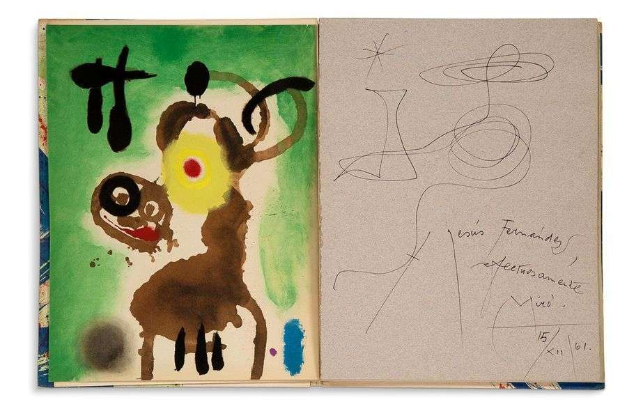 Envoi autographe manuscrit à l'encre avec GRAND DESSIN sur une page entière, adressé à «Jesus Fernández, Afectuosamente. Miró.