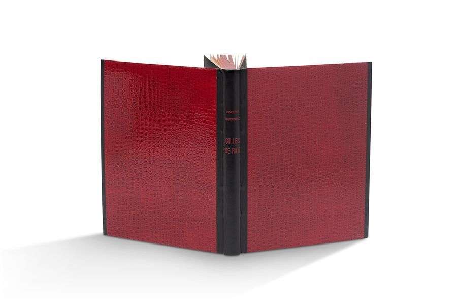 bl. avec un papier oblong dactylographié sur papier orange monté sur onglets. Demi-veau noir à bandes, panneaux de vernis rouge en imitation serpent, dos long, tranches rouges, couverture et dos conservés, chemise et étui (Reliure Georges Leroux).