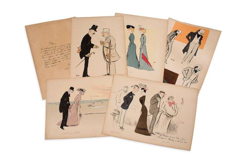 Ensemble sous portfolio contenant 35 planches préparatoires colorisées ou rehaussées de blanc, représentant différentes scènes du quotidien avec une galerie de personnages célèbres dont le baron et la baronne de Rothschild, le vicomte Louis de Turenne, Pierre d'Arenberg, etc.