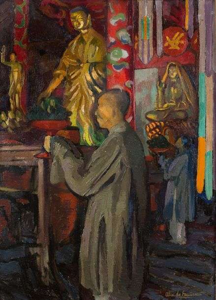 Cette oeuvre caractéristique de l'artiste, tant par sa palette, que par sa touche ou encore son médium, illustre pleinement la passion qu'il voue au continent asiatique. La précision qu'elle apporte au décor à travers ces motifs de colonnes, ces statues, ou encore les vêtements des moines permet d'identifier le temple de Yuantong à Yunnan Fu en Chine (aujourd'hui Kunming dans la province du Yunnan), région où elle s'est maintes fois rendue.