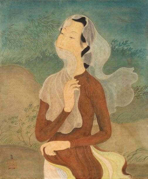Si la beauté féminine a su de tout temps inspirer les artistes, elle est chez Mai Trung Thu un sujet de prédilection. En s'appuyant sur une composition dénuée d'artifice et une palette sobre, l'artiste rend hommage à la féminité tout en célébrant la beauté naturelle du modèle. À travers de larges aplats lisses permis par cette technique de peinture sur soie, il souligne la douceur du personnage. Le très fin cerné noir participe à la délicatesse de la composition. Par ailleurs, le charme de cette oeuvre est renforcé par le mouvement qui y règne. Une impression de rondeur est rendue grâce aux différentes ondulations du modèle faisant écho au mouvement du voile. Des montagnes sphériques aux herbes tournoyantes, le décor complète ces arrondis. La force du regard de la jeune femme met en exergue cette atmosphère agitée. Tout en célébrant la beauté féminine dans sa simplicité, Mai