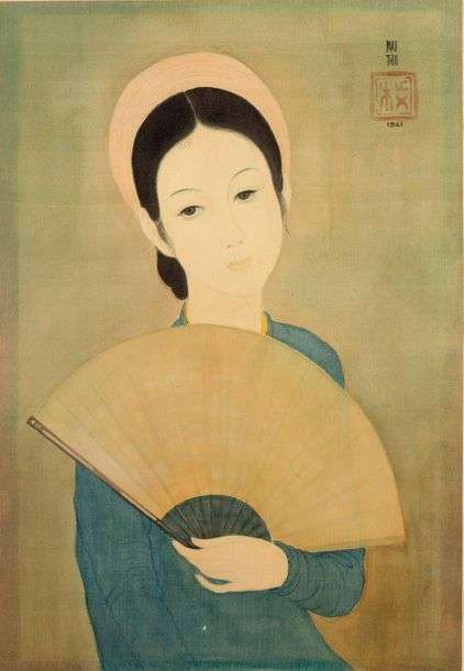 Depuis le XVIIe siècle, le genre du portrait est l'un des plus nobles. Assurant à son commanditaire un faire-valoir, il a évolué au fil des siècles, permettant aux artistes d'exprimer leur créativité ainsi que leur talent. Mai Trung Thu, artiste essentiel de la première promotion de l'Ecole des Beaux-Arts d'Hanoï excelle dans ce genre pictural. L'éventail en est un saisissant exemple. Le cadrage occidental évoque l'art du portrait classique. Le modèle est au centre, dans un arrière-plan épuré. Grâce à ce choix dans la composition rien ne détourne l'attention de cette jeune femme. À la manière des plus grands portraitistes, Mai Trung Thu ajoute un attribut : l'éventail. Seul élément de décor, il renforce l'idée de délicatesse émanant de l'oeuvre grâce à un subtil jeu de transparence. Le tracé très fin souligne la douceur de ce visage aux yeux mélancoliques. La palette très douce est habilement rehaussée par une touche de jaune venant relever la tenue traditionnelle de cette jeune femme. Reprenant les codes occidentaux du portrait, Mai Trung Thu parvient à coucher sur la soie une jeune vietnamienne incarnant un idéal de beauté.