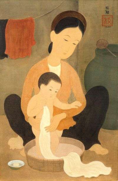 Bien que formé par un enseignement occidental et résidant en France, la culture vietnamienne s'exprime toujours de façon constante dans ses oeuvres. Le Bain en est l'exemple parfait. Reprenant un de ses thèmes favoris, la maternité, Mai Trung Thu fait honneur à une routine ordinaire et sublime le quotidien. Multipliant les références à sa culture d'origine, chaque élément contribue à la tendresse de la scène. Le décor aux lignes épurées est composé d'une jarre, subtile référence à son pays. Les traits de la jeune femme sont ceux d'une vietnamienne, délicats et fins. Si la douceur émane de cette oeuvre, la composition n'en est pas pour autant figée. En effet, les plis du linge séchant et du drap de bain apportent à cette scène un certain dynamisme. Fier de ses origines, l'artiste parvient à offrir ce que le subtil métissage occidental extrême-oriental a de plus beau.