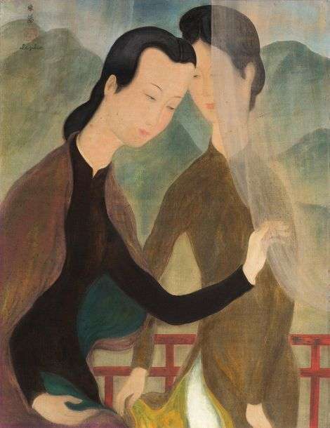 Si la délicatesse des jeunes femmes vietnamiennes devait prendre forme à travers un pinceau, elle se ferait sans conteste à travers celui de Le Pho. Formé à l'école des Beaux-Arts d'Hanoï et donc riche d'un apprentissage binational, l'artiste rend comme peu d'autres cette douceur si particulière. Tout dans cette composition invite à la rêverie, à la contemplation. Des montagnes tonkinoises formant le décor, au voile à la délicate transparence, l'oeil du spectateur se perd, contemple et admire la sérénité de ces deux jeunes soeurs. D'une main gracile rappelant la ligne serpentine chère aux maniéristes de la Renaissance, la jeune femme retient ce voile, laissant entrouvert au regard indiscret cette scène d'intimité au balcon. D'une main de maître, Le Pho offre un vibrant hommage à la grâce féminine.