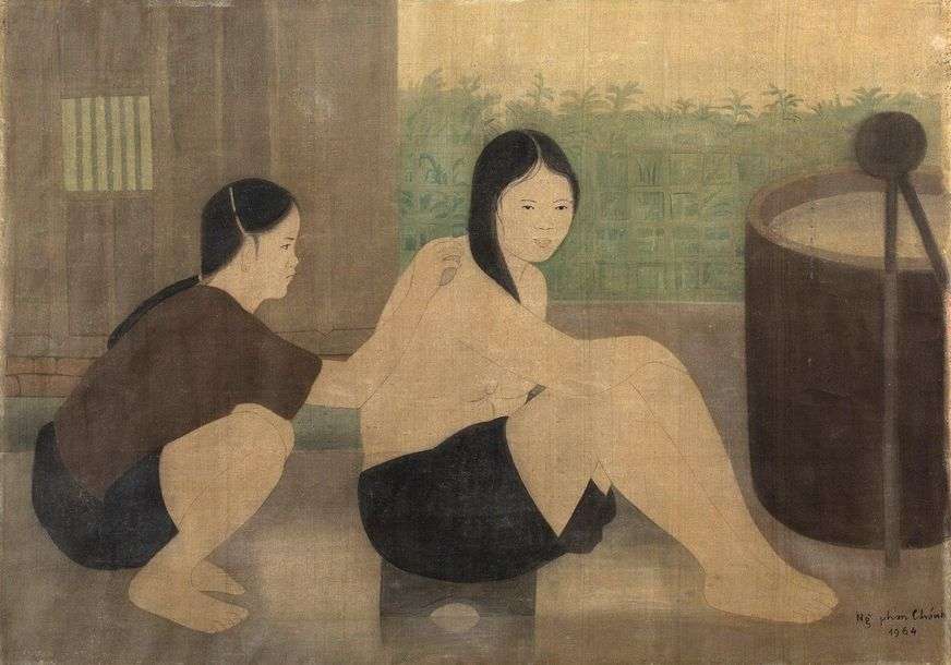 Seul élève de la première promotion issu du centre du Vietnam, Nguyen Phan Chanh fait de ses origines modestes une source d'inspiration. Les scènes quotidiennes deviennent sujet, les ruraux ses personnages favoris. La Toilette illustre délicieusement le talent de l'artiste à capturer ces moments de vie. La technique employée faite de grands aplats lisses permet un grand réalisme et apporte à la scène une minutie toute particulière. Le décor composé uniquement d'éléments essentiels est ainsi sobre, ce qui le rend d'autant plus intime. Calmes et sereines, les deux jeunes femmes ne croisent pas le regard du spectateur. La palette faite majoritairement de tonalités brunes souligne le côté traditionnel de cette scène. Sensible à l'humilité et à l'intimité de la vie quotidienne, Nguyen Phan Chanh a maintes fois reproduit ce sujet emblématique de son travail.