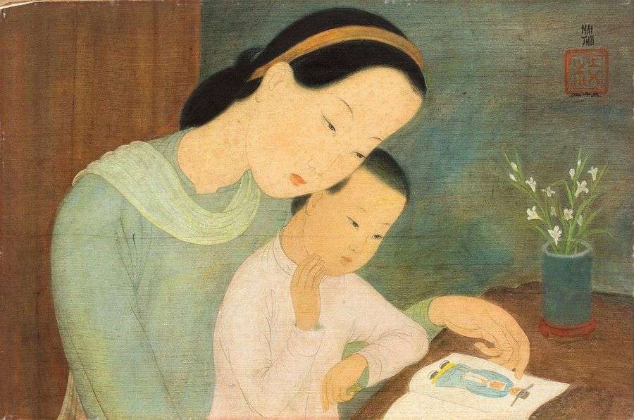 Peintre de l'intimité et de la famille, cette oeuvre illustre merveilleusement le talent de l'artiste à retranscrire l'amour maternel. La sérénité de la composition est permise par une palette douce où les couleurs se font délicatement écho. Ainsi la discrète teinte rouge de la bouche de la mère se retrouve dans le support du vase. Les tonalités céladons très présentes participent au côté paisible de cette scène. L'arrière-plan épuré laisse apparaître le travail de la perspective. Penchés sur un livre, les visages accolés, la mère et son enfant sont absorbés par leur lecture. La ligne simple et pourtant hautement maîtrisée offre des visages délicats, aux traits graciles. Fin portraitiste, l'artiste parvient à retranscrire avec brio cette complicité. D'une main de maître, Mai Trung Thu invite le spectateur à partager ce moment heureux.
