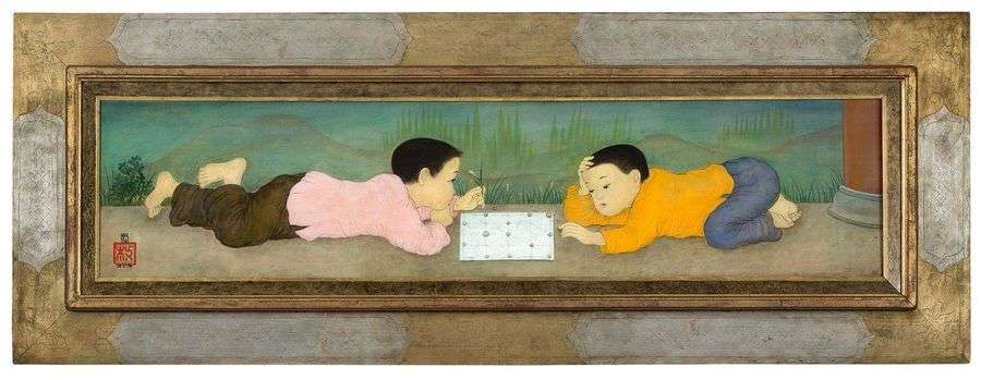 Mai Trung Thu, le plus politisé des élèves de la première promotion de l'Ecole d'Hanoï se démarque de ses camarades par le choix de certains de ses sujets. Marqué par la guerre sévissant au Vietnam, c'est tout naturellement qu'il décide de mettre son talent au profit de l'UNICEF, le Fond des Nations Unies pour l'Enfance. Ainsi, l'artiste réalise de nombreuses oeuvres mettant en scène des enfants jouant. De son pinceau agile et appliqué, l'artiste parvient à faire oublier le lot de dureté vécu par les enfants frappés par les sévices de la guerre. Ici, l'innocence enfantine prend possession de la composition. D'une technique raffinée et précise permise par le cerné noir, l'artiste parvient à souligner la candeur de ces jeunes enfants jouant au Xiangqi, jeu d'échec chinois