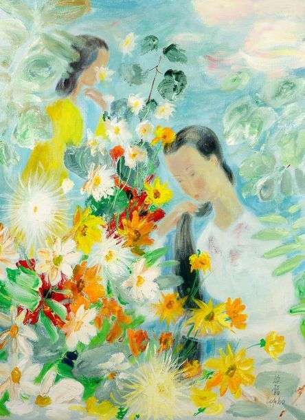 Maîtrisant à la perfection le caractère enchanteur des floraisons, l'artiste parvient à moderniser ce genre pictural traditionnel grâce à une composition innovante où le cadrage très moderne pourrait rappeler les oeuvres de Chagall. Le grand format employé pour Jeunes filles dans un jardin fleuri participe au caractère exceptionnel de cette oeuvre. De ses années d'apprentissage à Hanoï, à ses années passées à Paris, Le Pho perfectionne sa technique et innove, rejoignant ainsi le panthéon des grands artistes représentant des fleurs.