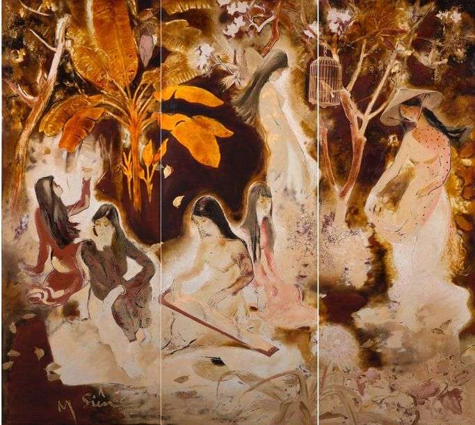 Laque, triptyque, signée sur le panneau de gauche en bas