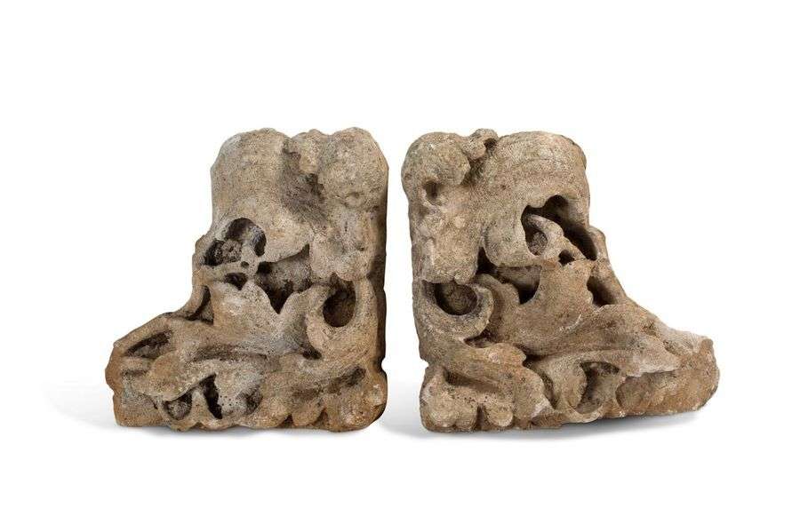 DEUX CHAPITEAUX en pierre calcaire normande sculptée provenant d'un décor