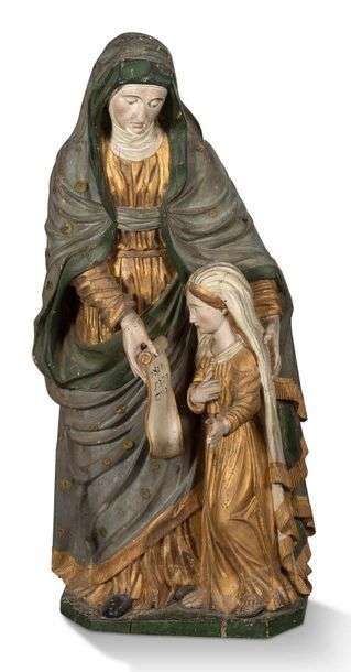 SAINTE ANNE ENSEIGNANTE en bois sculpté, polychromé et doré, dos évidé. Sainte Anne présente à la Vierge encore enfant un parchemin portant des inscriptions en latin et en hébreux.