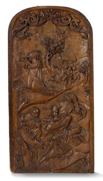 GRAND PANNEAU de forme cintrée en noyer sculpté en bas-relief représentant Jésus au Jardin des Oliviers. Au registre supérieur, le Christ est à genoux, les mains jointes en prière, tandis que derrière lui des soldats arrivent accompagnés de Judas | au registre inférieur, trois disciples sont endormis dont Jean s'appuyant sur un livre et Pierre tenant une épée | rinceaux feuillagés à têtes de dauphin première Renaissance à la partie supérieure. Numéro d'inventaire et étiquettes de collection au dos.