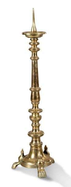 PAIRE DE PIQUE-CIERGES en cuivre doré reposant sur trois pieds griffes, fû