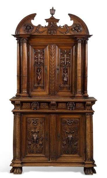 MEUBLE RENAISSANCE à deux corps en noyer mouluré sculpté. La partie supérieure ouvre par deux portes ornées de Mars et Vénus dans des niches richement sculptées de feuilles d'acanthe et flanquées de colonnettes corinthiennes détachées.