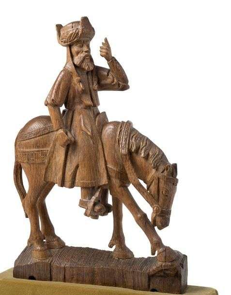 CAVALIER en chêne sculpté, élément d'une Crucifixion d'un retable, dos ébauché. Personnage barbu, coiffé d'un chapeau aux bords relevés et d'un turban | il devait tenir une bannière de ses deux mains.