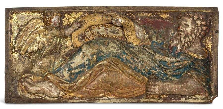 PAIRE DE PANNEAUX en noyer sculpté en bas-relief, polychromé et doré représentant les deux Evangélistes, Mathieu et Luc, accompagnés de leurs attributs respectifs, l'ange pour le premier, le taureau, pour le second.