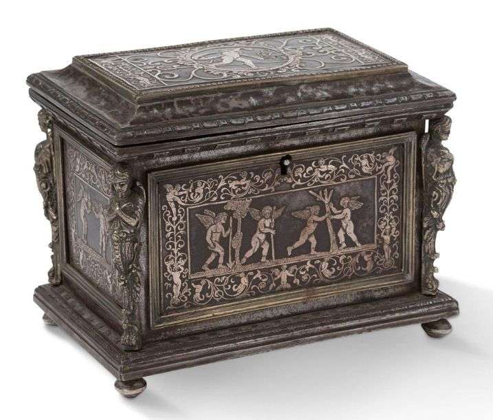 COFFRET en fer damasquiné argent à décor de putti jardinant ou jouant la comédie dans des encadrements de rinceaux animés | cariatides engainées en bronze argenté aux quatre angles | pieds boules.