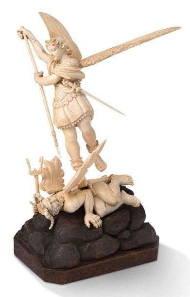 SAINT MICHEL TERRASSANT LE DRAGON en ivoire sculpté en ronde-bosse s'inspirant du «Grand saint Michel» de Raphaël | socle en bois sculpté en forme de rocher.