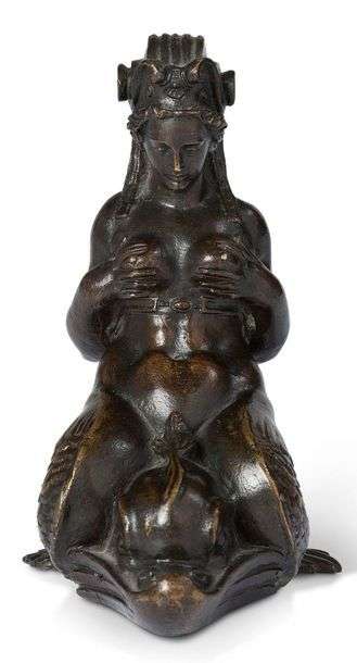 STATUETTE en bronze finement ciselé et patiné représentant une néréide assise sur un dauphin faisant jaillir l'eau nourricière de sa poitrine | elle est coiffée d'un casque à enroulements.