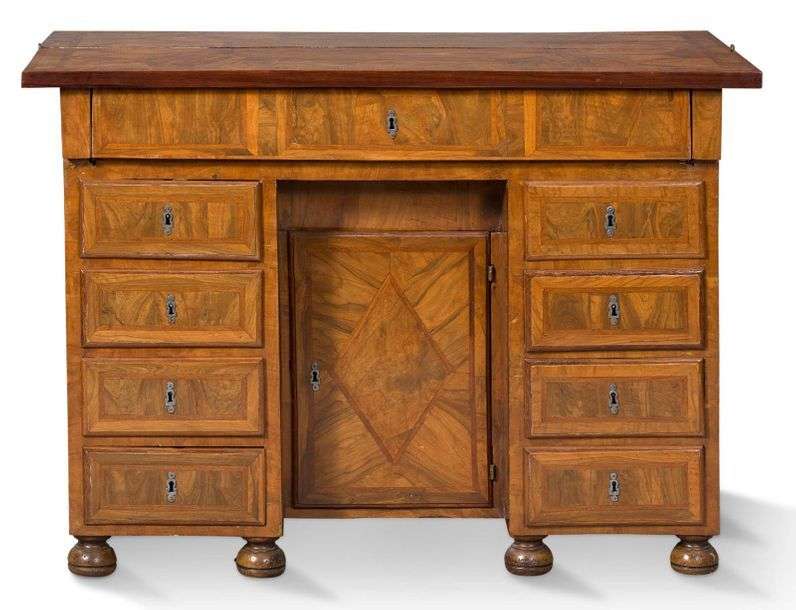 BUREAU DE CHANGEUR en placage de bois de violette marqueté dans des encadrements à filet. Le plateau à dessus brisé, à façade à abattant, dissimule trois tiroirs. À la partie inférieure une porte en retrait, encadrée de neuf tiroirs. Pieds tournés.