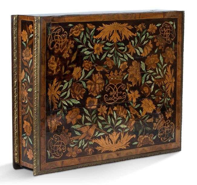 GRAND COFFRET rectangulaire marqueté de feuillages, de fleurs et d'oiseaux, rehaussé d'écaille teintée verte. Le couvercle centré et aux coins, d'initiales entrelacées soutenant une flêche sommées d'une couronne de marquis. Il est ceint de baguettes de bronze ciselé doré d'oves. XVIIe siècle