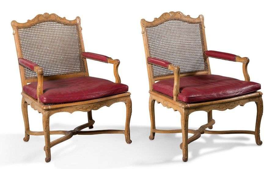 SUITE DE QUATRE FAUTEUILS cannés à dos plat en bois naturel mouluré sculpté de coquilles, feuillages et croisillons. Les supports d'accotoirs cambrés reposent sur une ceinture chantournée. Quatre pieds légèrement cambrés terminés par des enroulements réunis par une entretoise en X ornée au centre d'une rosace.