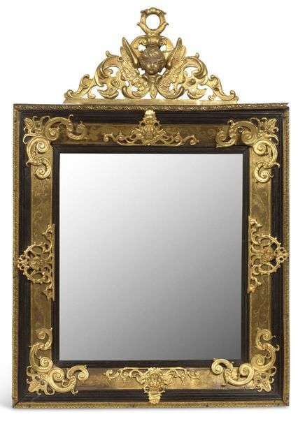 MIROIR DE FORME RECTANGULAIRE en ébène et bronzes ciselés dorés. Le pourtour du miroir est ajouré de plaques de bronzes dorés à motifs de feuillages gravés au tremblé. Dans les écoinçons et sur les arêtes, six éléments en applique à motifs de masques empanachés et arabesques viennent orner le miroir. Il est sommé d'un fronton ajouré orné au centre d'une tête d'angelot flanquée d'ailes déployées.