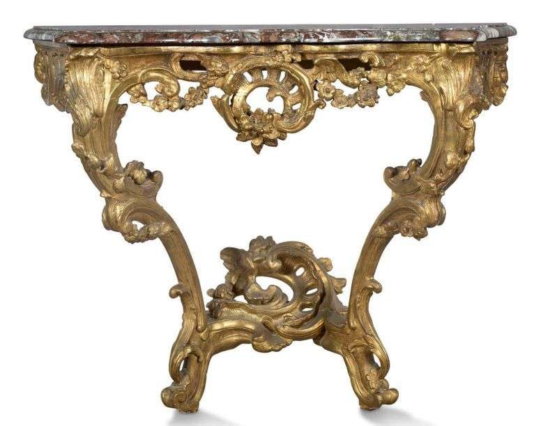 CONSOLE GALBÉE en bois richement sculpté et ajouré à décor rocaille de coquilles, agrafes, frises florales reposant sur deux pieds en console. Plateau de marbre rouge veiné gris rapporté.