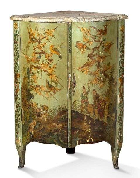 ENCOIGNURE en vernis Martin à fond vert représentant une scène chinoisante dans un décor de branchage aux oiseaux.