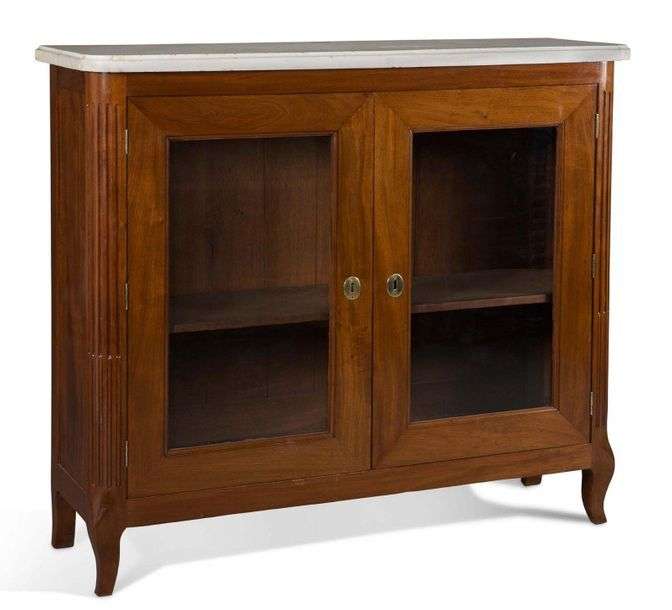 PAIRE DE VITRINES D'ENTRE-DEUX en acajou et placage d'acajou,reposant sur des pieds sinueux et aux montants cannelés rudentés. Ouvre par deux vantaux vitrés. Plateau de marbre blanc.