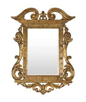 MIROIR en bois mouluré sculpté et doré de forme rectangulaire à décor ajouré de volutes et acanthes. Le pourtour porte les inscriptions : Napoli, Verona, toscana, Roma, Messina, Modena, Genova, Firenze, Pisa, Venezia. Travail italien du XXe siècle