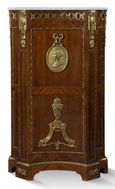 MEUBLE À HAUTEUR D'APPUI en bois de rose. Riche ornementation de bronze doré ciselé. Rosaces en partie inférieure. S'ouvre par un vantail central à décor d'une urne à l'antique ceinte d'une guirlande florale. En partie supérieure un médaillon enrubanné à l'effigie d'une reine. frises de poste et médaillon au motif d'Hercule et Cerbère aux écoinçons dans des guirlandes de feuilles de chènes.