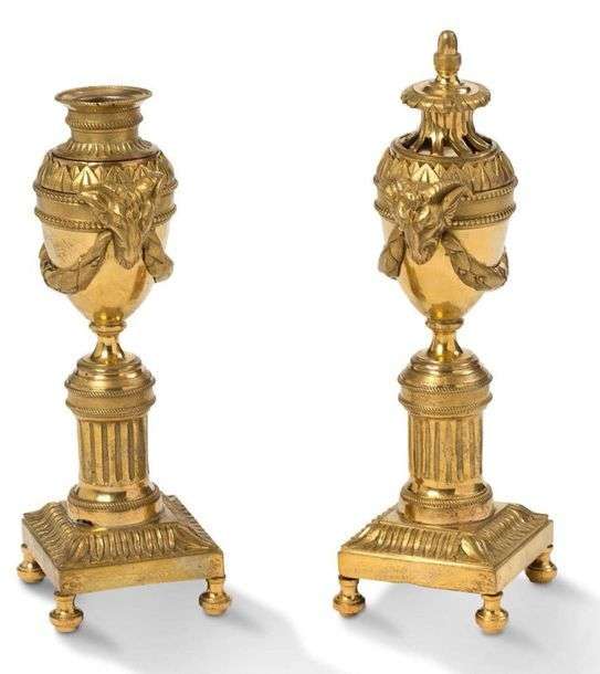 ?PAIRE DE BOUGEOIRS-CASSOLETTES en bronze ciselé et doré à décor de têtes de boucs soutenant des guirlandes feuillagées | les bobèches contenues dans les couvercles réversibles reposent sur des fûts cannelés et bases à raies de coeur reposant sur des pieds boules aplatis.