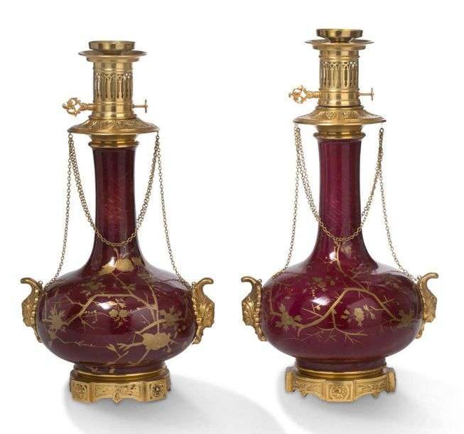 PAIRE DE VASES MONTÉS en lampe en porcelaine pourpre réhaussée de décors végétaux à l'or. Monture en bronze doré ciselé à décor de guirlandes florales.