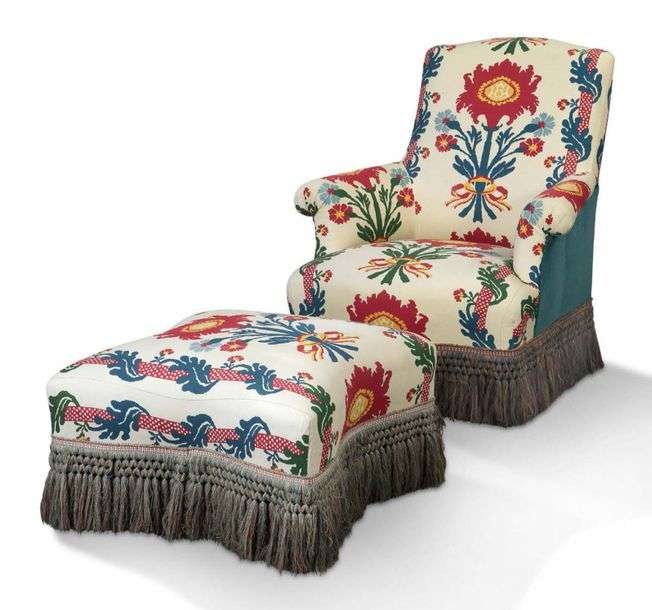 PAIRE DE DEUX DUCHESSES brisées recouvertes de tissu à fleurs avec franges et pompons