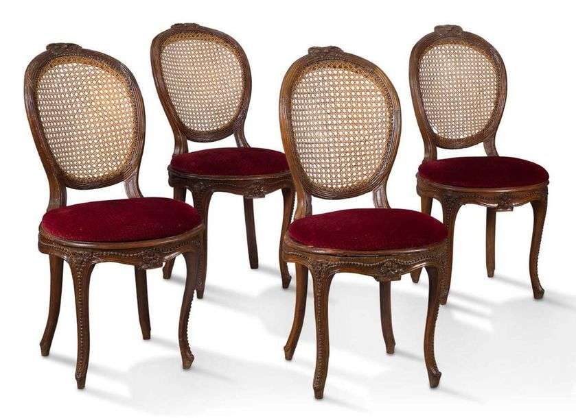 HUIT CHAISES ET DEUX FAUTEUILS CANNÉS en bois naturel mouluré sculpté, reposant sur des pieds sinueux à décor de frises de perles et fleurettes en ceinture. Dossier ovale enrubanné.