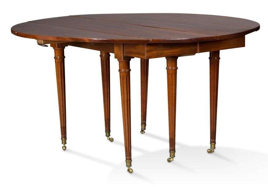 GRANDE TABLE en acajou et placage d'acajou à trois allonges, reposant sur six pieds fuselés cannelés à roulettes.
