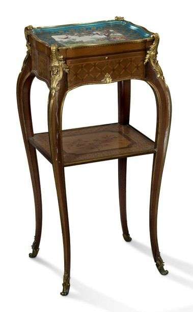 TABLE-CABARET reposant sur des pieds sinueux réunie par une tablette d'entretoise à décor floral. Ornementation de bronze ciselé doré aux coins, de coquilles écorchées dans un entourage floral. Ceinture à croisillons fleuris. Plateau supérieur en porcelaine polychrome à décor d'une scène animalière, de renard et d'oiseaux.