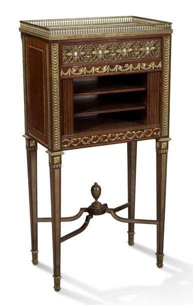 CHEVET en acajou et riche ornementation de bronze ciselé et doré reposant sur des pieds gaines réunies par une entretoise en X soutenant une urne feuillagée. En partie supérieure, décor floral classique et de colombes à incrustation de rosaces en plaques de Wedgwood. Un vantail coulissant découvre trois caissons. Plateau supérieur en marbre blanc veiné gris ceint d'une frise de perles.