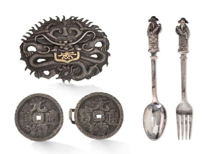 Ensemble comprenant une boucle de ceinture représentant un dragon, deux pièces, une cuillère et une fourchette surmontées de deux dignitaires.