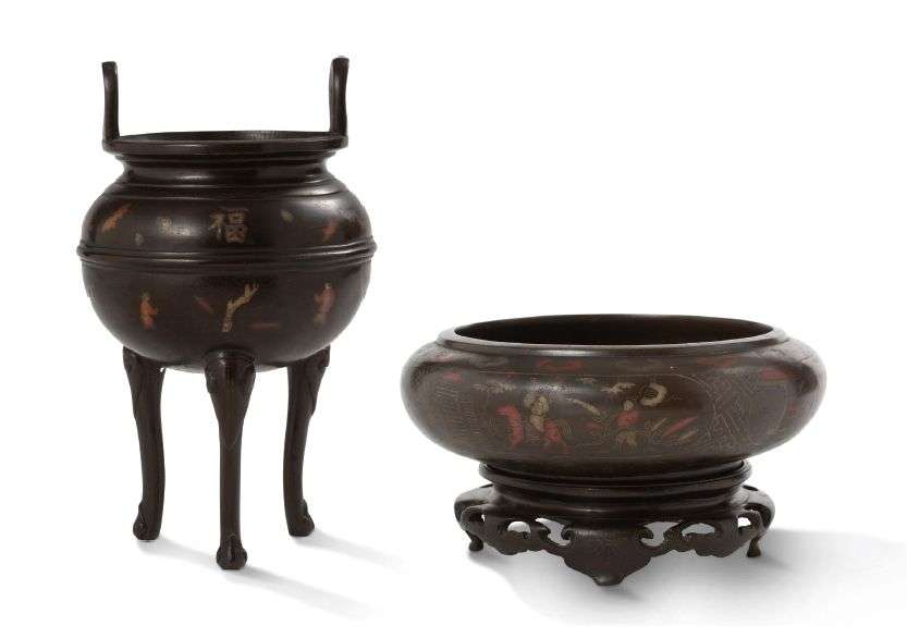 Lot de deux brûle-parfums en bronze, l'un tripode à petites anses, l'autre à fond plat et panse galbée sur un socle | tous deux à décor niellé et rehaussé de laque rouge, de scènes animées de personnages, motifs floraux et auspicieux.