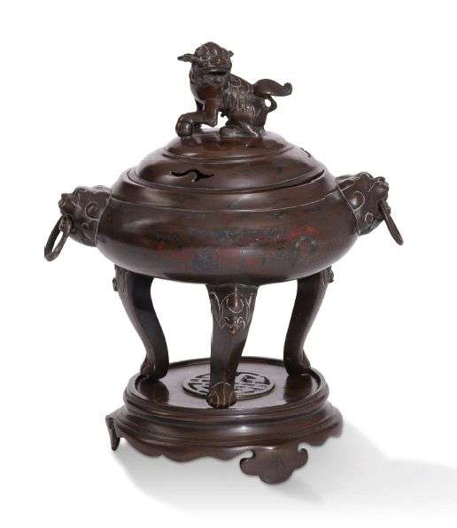 Brûle-parfum tripode couvert avec son socle, en bronze, la panse à décor niellé et laqué rouge et noir de cavaliers et personnages auprès de pavillons, et rehaussée de deux têtes de félins en bas-relief portant des anneaux mobiles.