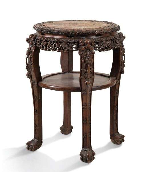 Sellette à plateau en marbre rose, en bois sculpté et ajouré de rinceaux de fleurs et fruits, et pétales de lotus stylisés, sur quatre pieds réunis par une tablette intermédiaire.