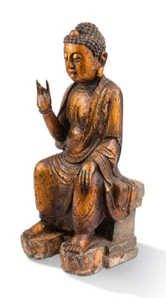 Sujet en bois laqué or, représentant le Bouddha assis en bhadrasana, les pieds posés sur des lotus, la main droite levée en vitarka mudra (geste de l'argumentation), la gauche posée sur le genou.