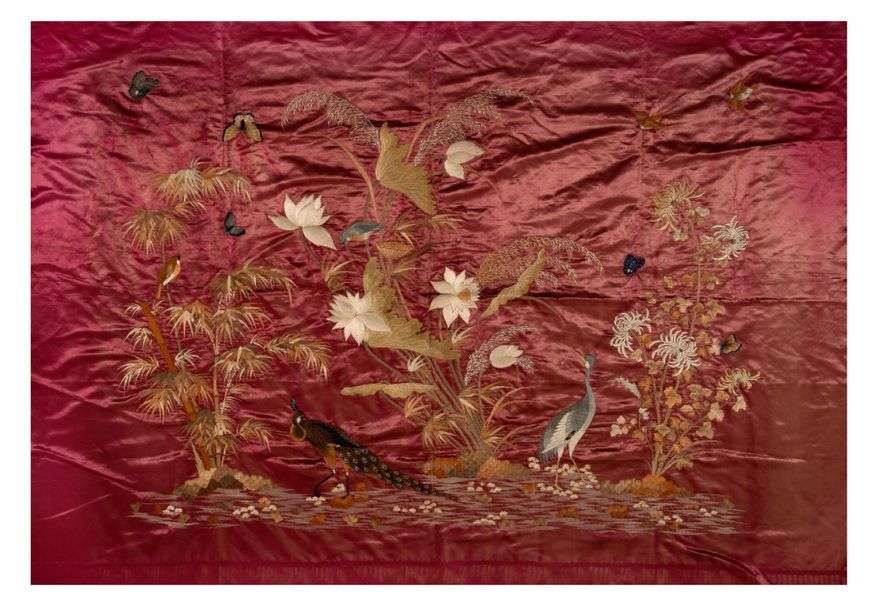 Grande tenture en soie rose foncé, brodée aux fils polychromes d'un paon, d'une grue et de papillons auprès de bambous, lotus et chrysanthèmes.