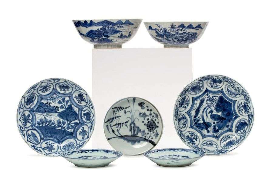 Lot de sept porcelaines bleu-blanc, comprenant deux petits plats creux polylobés de type Kraak, formant pendants, à décor central de berges arborées, entouré de médaillons floraux, des concrétions au revers de l'un| trois petites assiettes ornées de motifs végétaux et deux bols à décor de paysages lacustres sur fond craquelé, avec la marque Nhat sur la base.