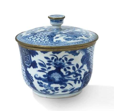 Coupe couverte en porcelaine bleu-blanc, la paroi à décor d'un dragon stylisé en prunus et d'une grenade dans son feuillage alternant avec des motifs de nids d'abeille.