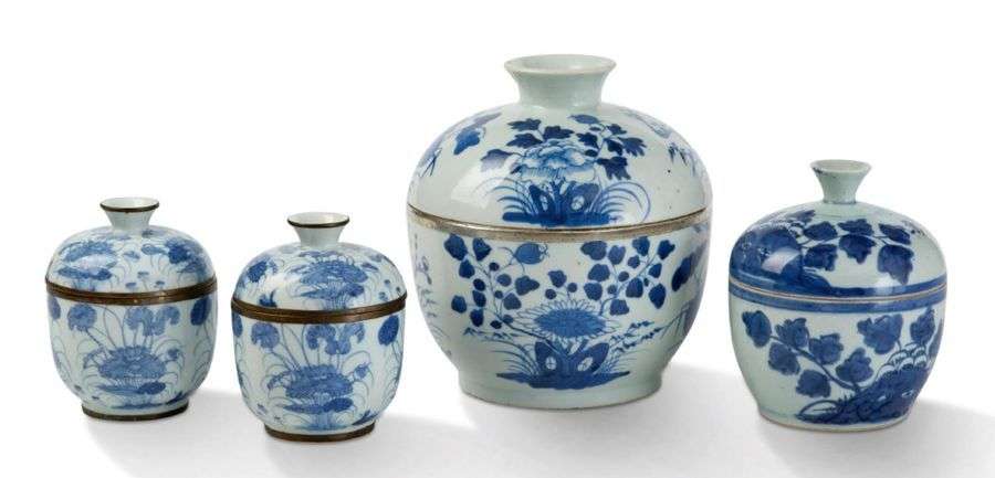 Ensemble de quatre coupes couvertes en porcelaine et bleu sous couverte, dont une paire à décor de fleurs de lotus | une ornée de fleurs et inscription auspicieuse | et une à motifs de prunus, pivoines, lotus et chrysanthèmes.